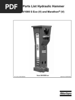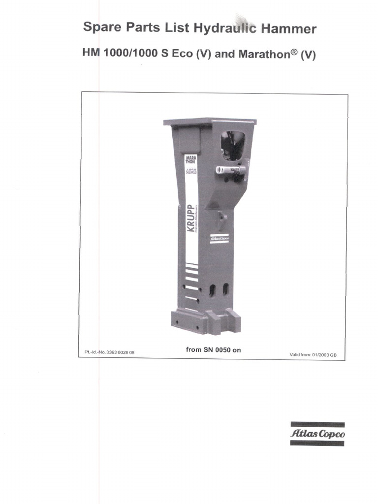 The document is a spare parts list for the HM 1000 series hydraulic hammers, detailing various models and their specific parts. It includes information on features, dimensions, weights, and ordering instructions for spare parts. The list is applicable to models manufactured from January 2003 onwards and provides part identification numbers for ordering.