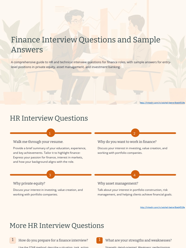 A comprehensive guide to HR and technical interview questions for finance roles, with sample answers for entry-
