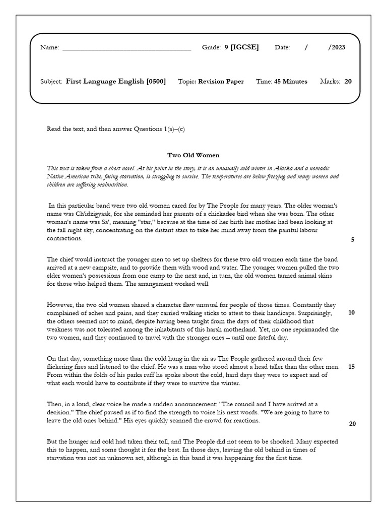 Read the text, Two Old Women, and then answer Questions 1(a)–(c) on this question paper.