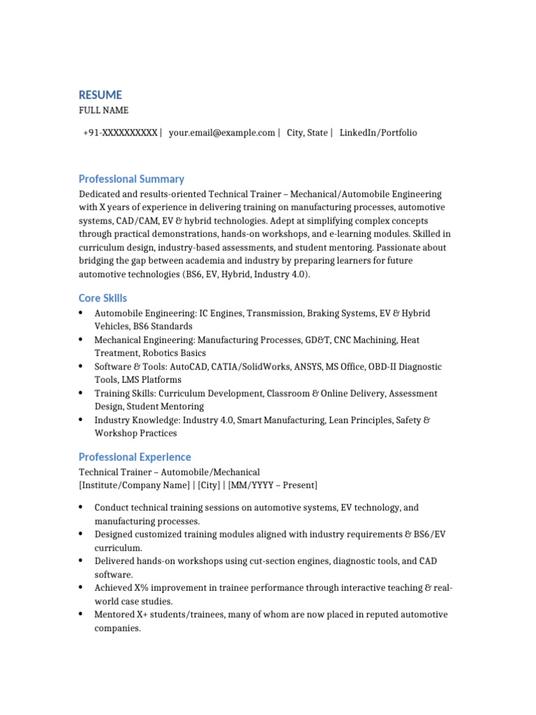 Dedicated and results-oriented Technical Trainer – Mechanical/Automobile Engineering