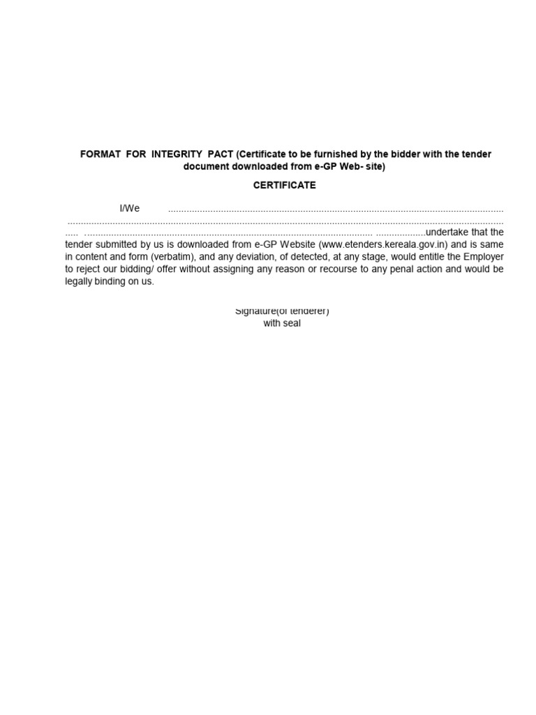 FORMAT FOR INTEGRITY PACT (Certificate to be furnished by the bidder with the tender