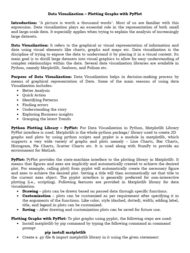 Visualization. We can create many different types of Graphs and Charts using pyplot. Some