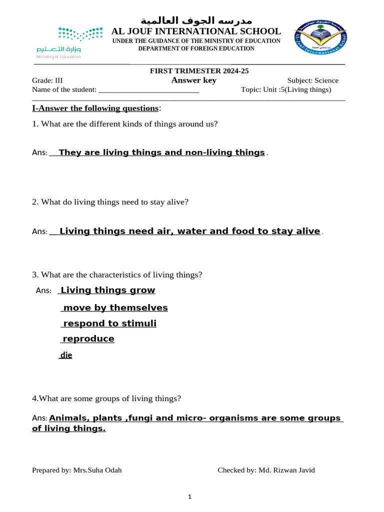 Grade: III Answer key Subject: Science