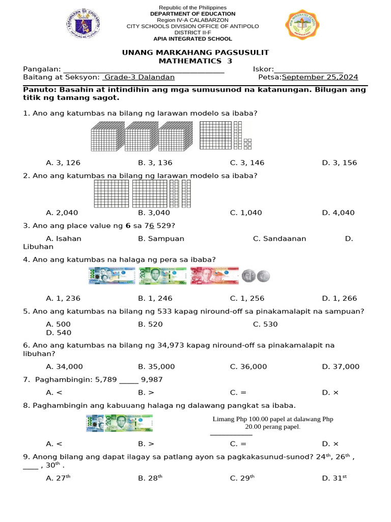 12. Tukuyin kung magkano ang pera at bilugan ang letra ng tamang sagot.
