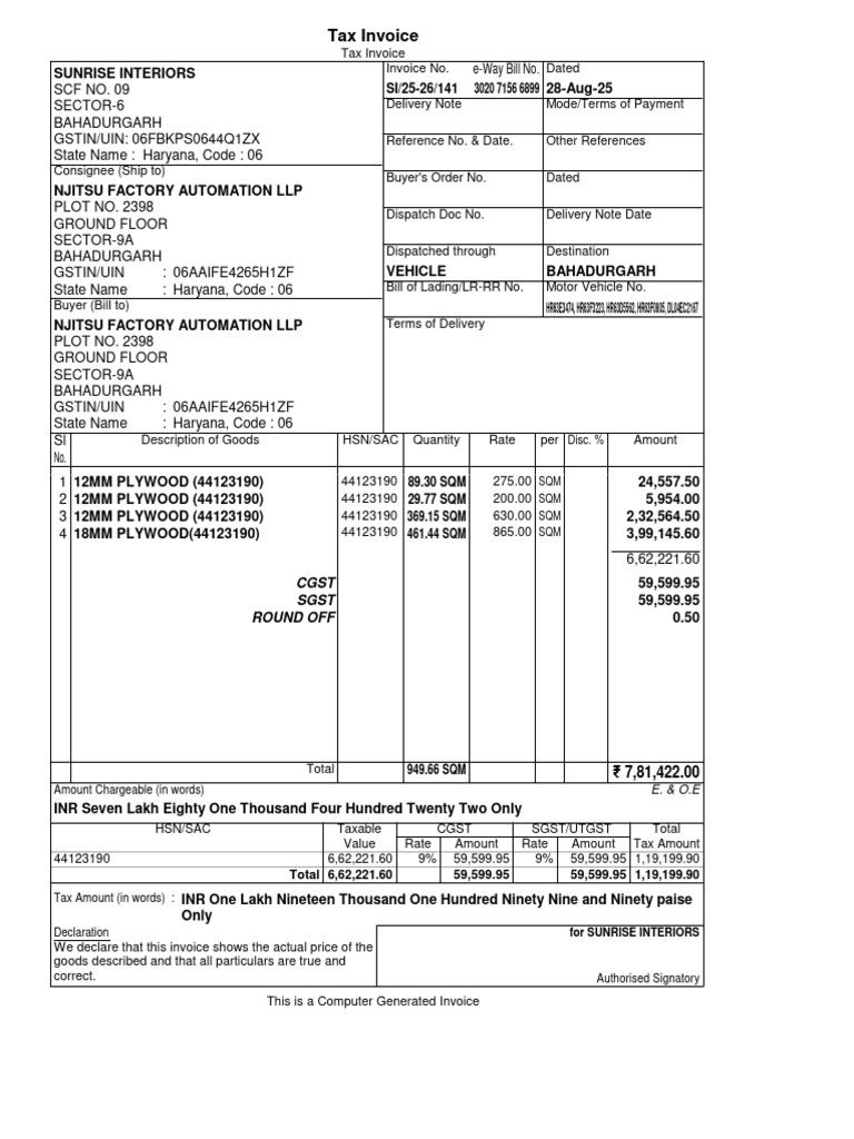 SUNRISE INTERIORS Invoice No. e-Way Bill No. Dated