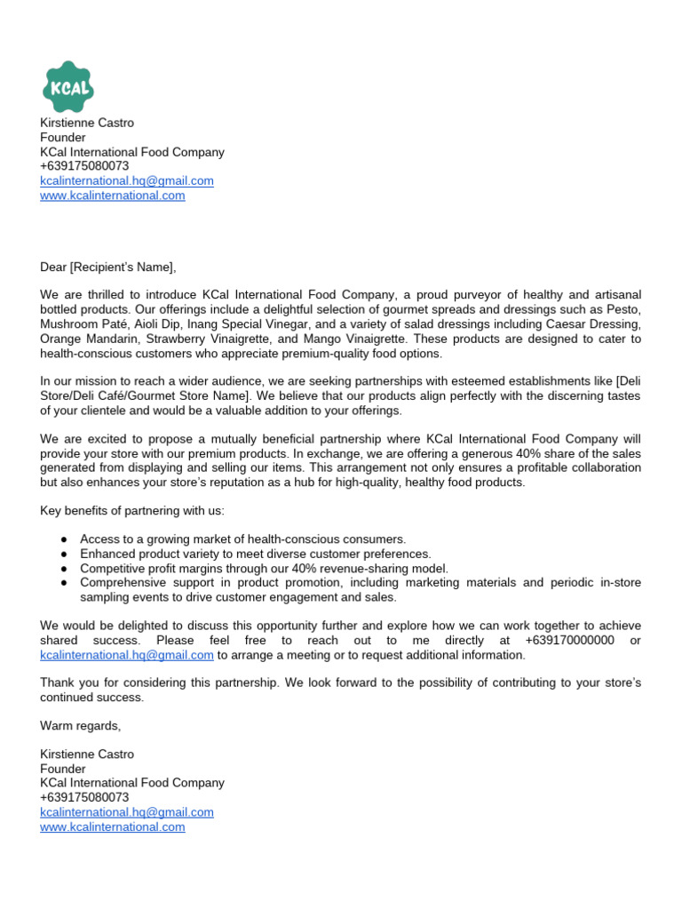 We are excited to propose a mutually beneficial partnership where KCal International Food Company will