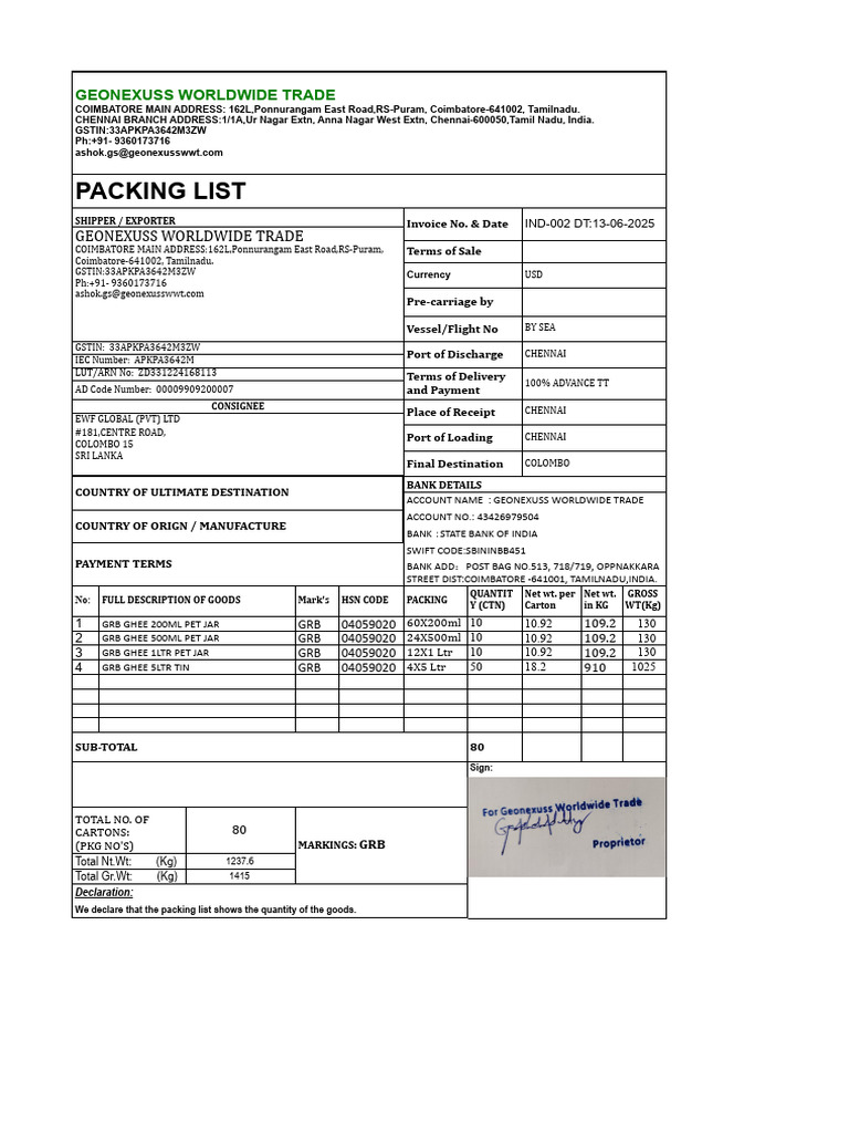 SHIPPER / EXPORTER Invoice No. & Date IND-002 DT:13-06-2025