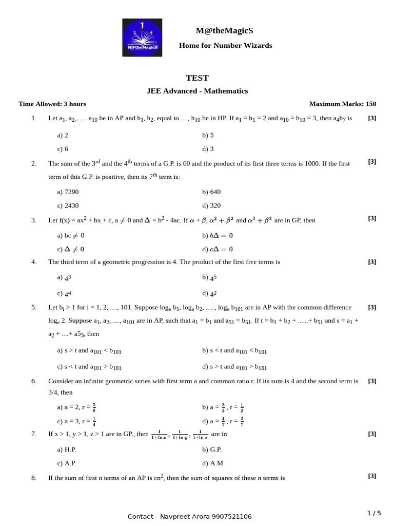 2. The sum of the 3rd and the 4th terms of a G.P. is 60 and the product of its first three terms is 1000. If the first [3]