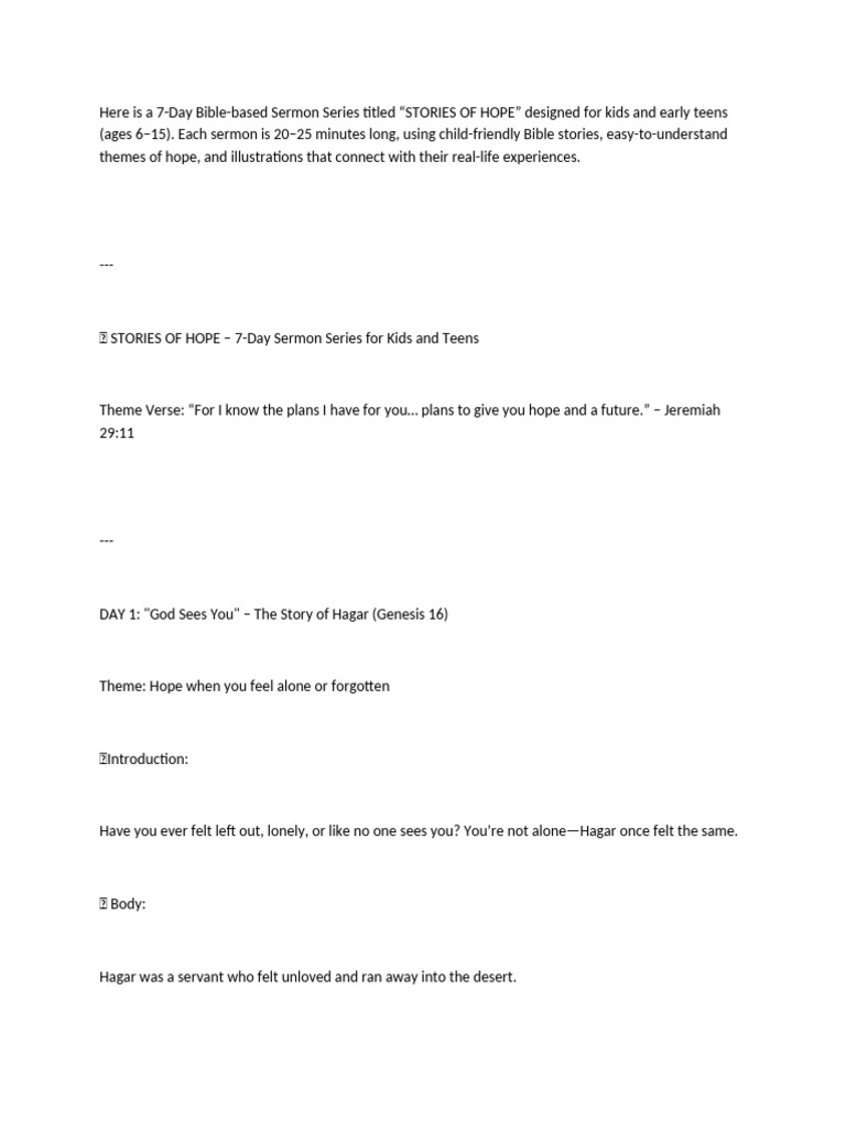 Here is a 7-Day Bible-based Sermon Series titled “STORIES OF HOPE” designed for kids and early teens