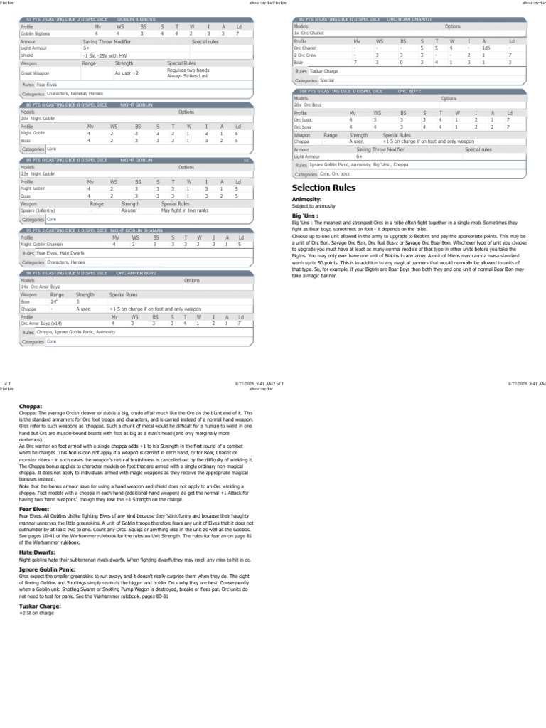 Night Goblin Shaman 4 2 3 3 3 2 3 1 5 a unit of Orc Bon. Savage Orc Bon. Orc !kat Bos-z or Savage Orc Boar Bon. Whichever type of unit you choose