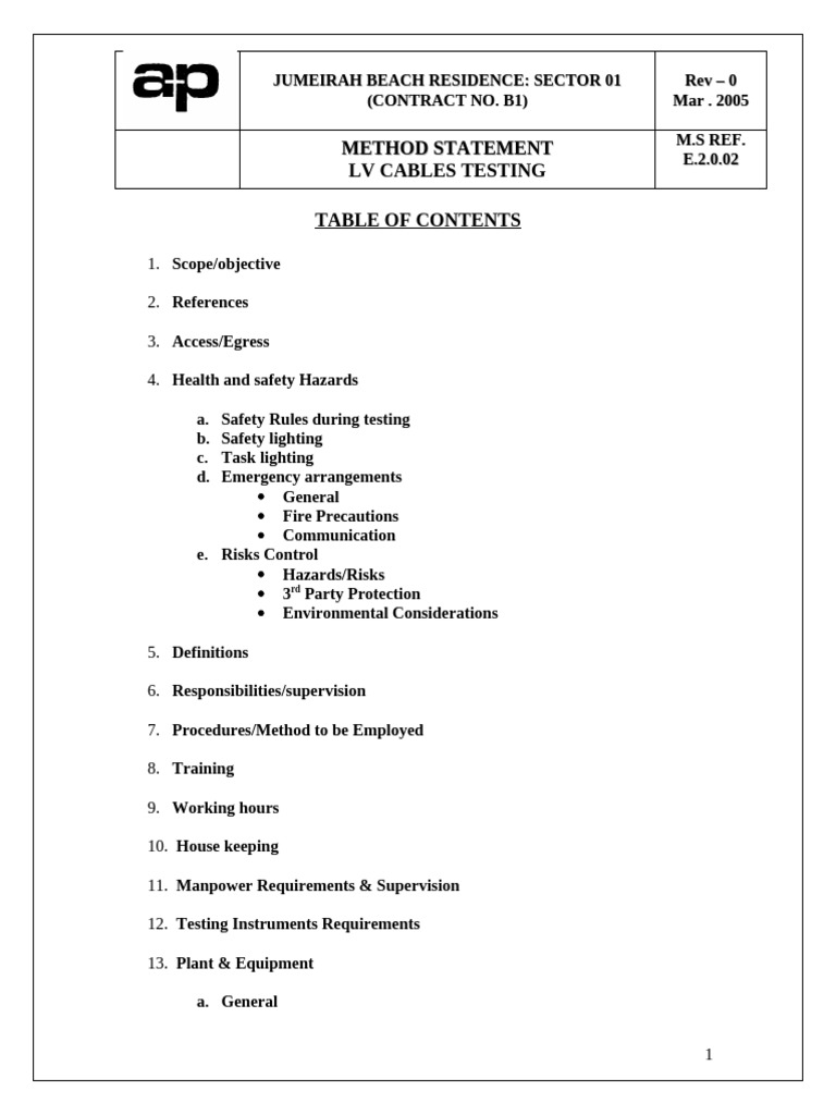 This method statement covers the testing of LV cables [insulation resistance test