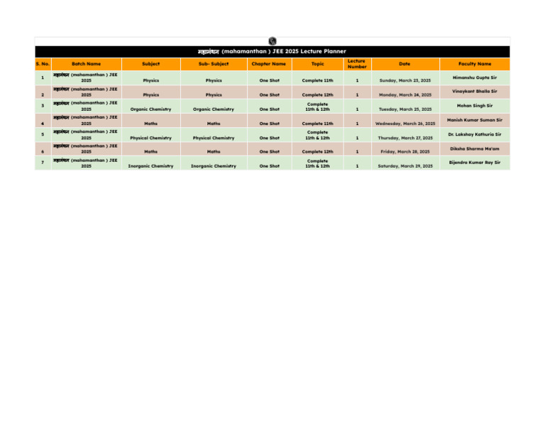 महामं थन (mahamanthan ) JEE 2025 Lecture Planner