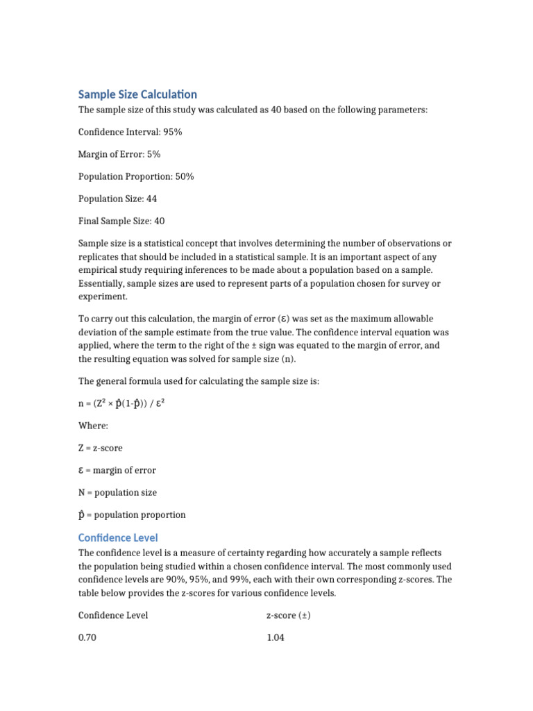The calculated sample size was 40, based on a population of 44. To account for potential