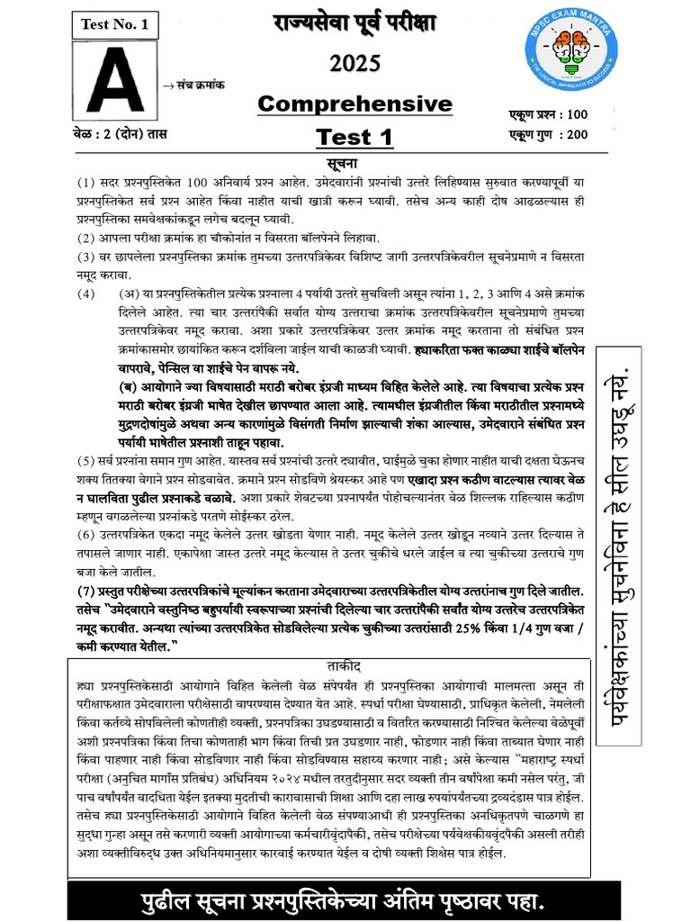 (1) सदर प्रश्नपुस्तिकेि 100 अननवार्य प्रश्न आहेि. उमेदवाराांनी प्रश्नाांची उत्िरे निनहण्र्ास सुरुवाि करण्र्ापूवी र्ा