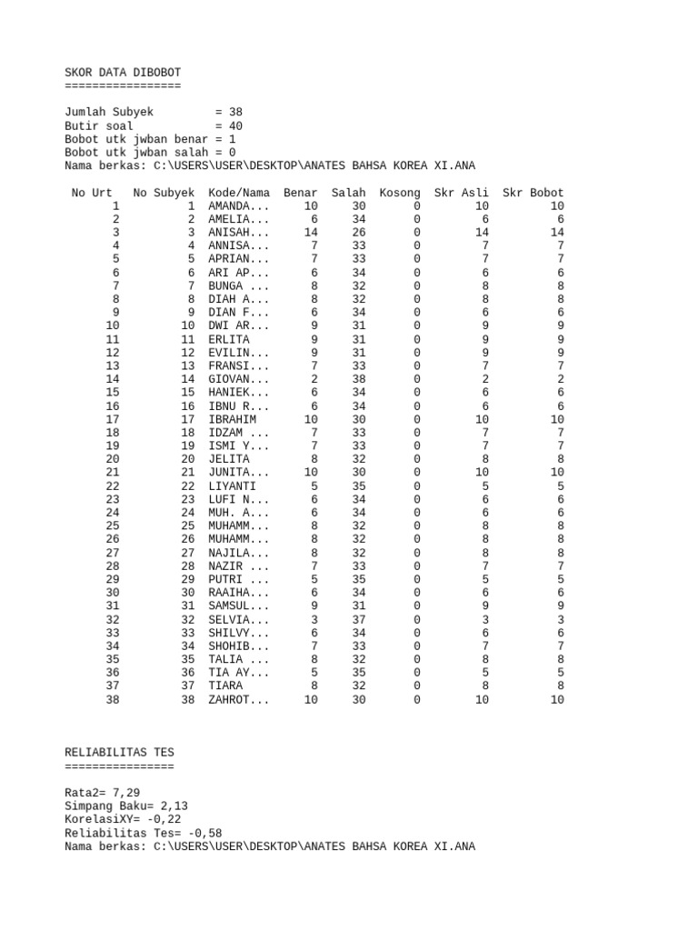 No Urt No Subyek Kode/Nama Benar Salah Kosong Skr Asli Skr Bobot
