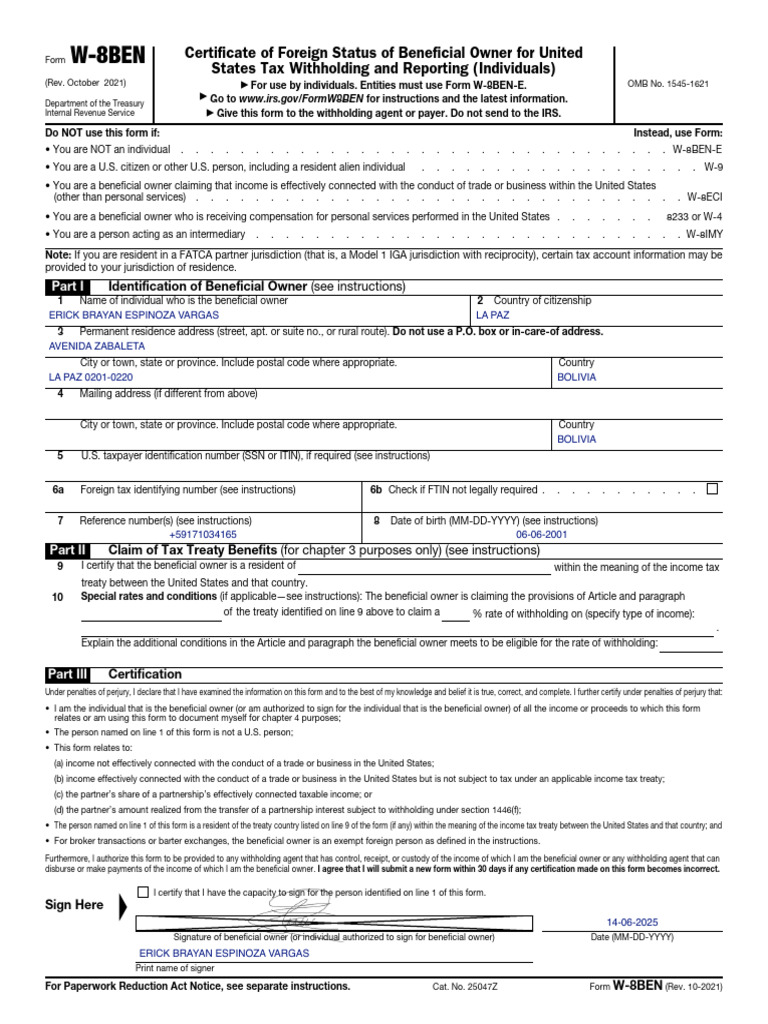 For Paperwork Reduction Act Notice, see separate instructions. Cat. No. 25047Z Form W-8BEN (Rev. 10-2021)