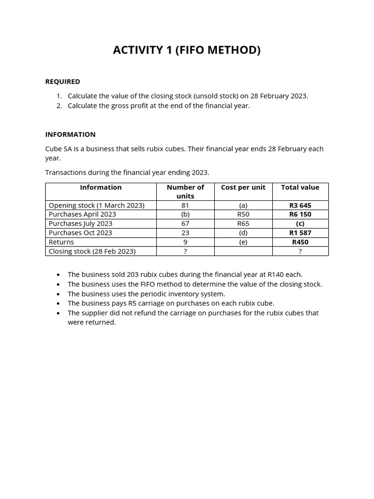 • The business sold 203 rubix cubes during the financial year at R140 each.
