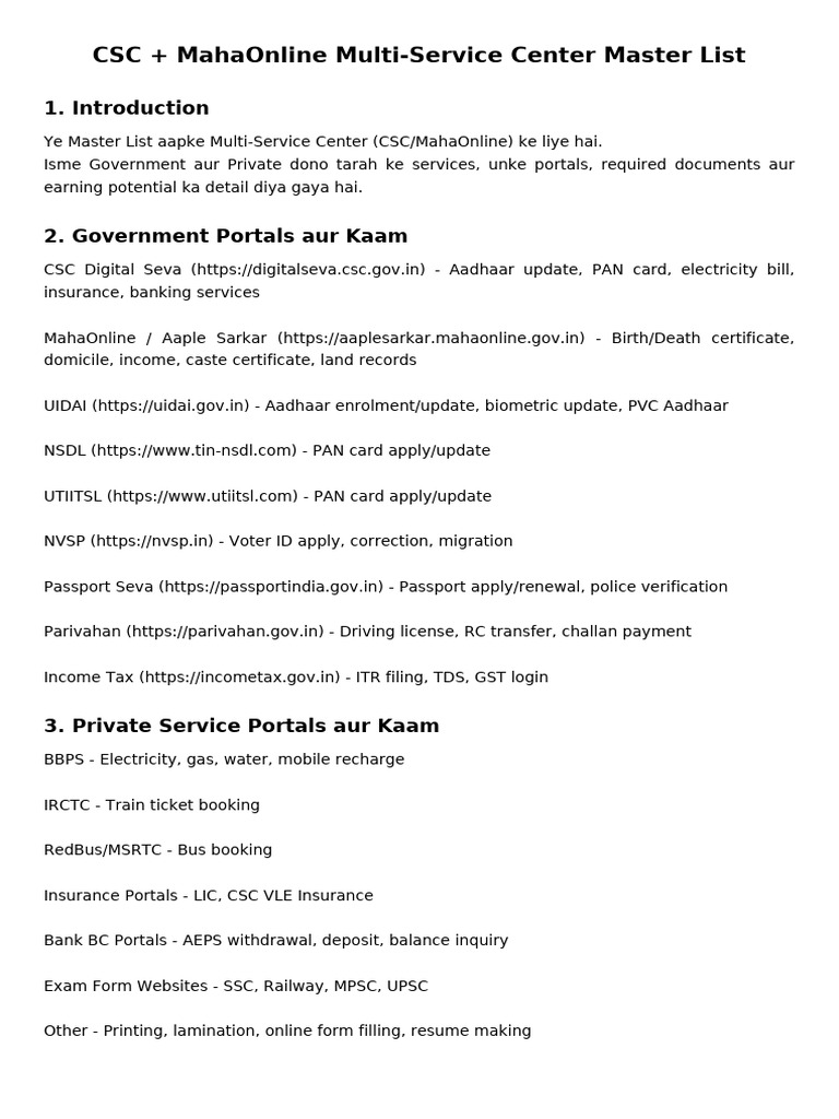 Ye Master List aapke Multi-Service Center (CSC/MahaOnline) ke liye hai.