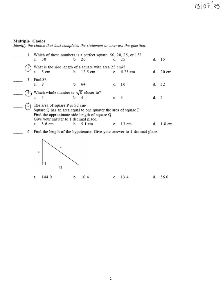 ____ 1. Which of these numbers is a perfect square: 50, 20, 25, or 15?