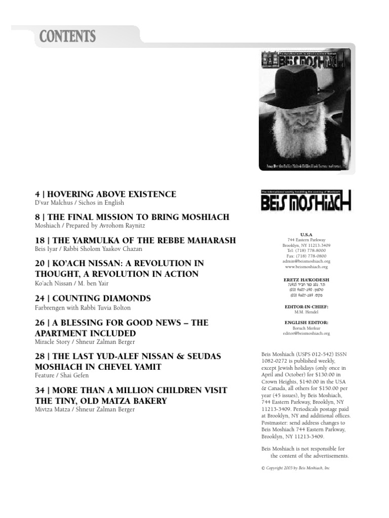 Beis Moshiach (USPS 012-542) ISSN 1082-0272 is published weekly, except Jewish holidays (only once in April and October) for $130.00 in Crown Heights, $140.00 in the USA & Canada, all others for $150.00 per year (45 issues), by Beis Moshiach, 744 Eastern Parkway, Brooklyn, NY 11213-3409. Periodicals postage paid at Brooklyn, NY and additional offices. Postmaster: send address changes to Beis Moshiach 744 Eastern Parkway, Brooklyn, NY 11213-3409. Beis Moshiach is not responsible for the content of the advertisements.