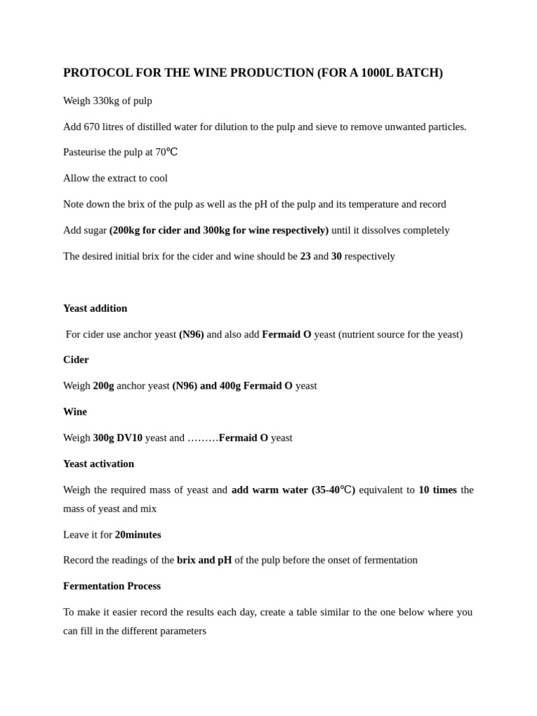 PROTOCOL FOR THE WINE PRODUCTION (FOR A 1000L BATCH)