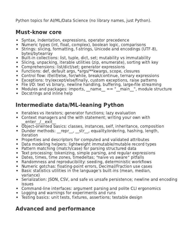 Python topics for AI/ML/Data Science (no library names, just Python).