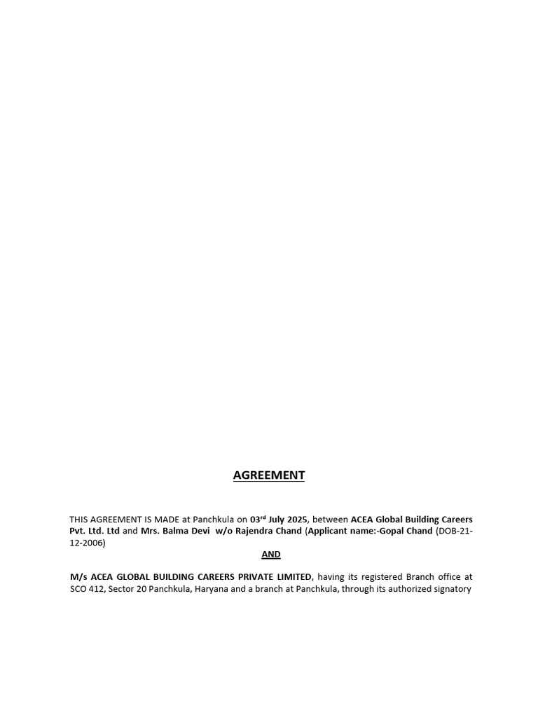 THIS AGREEMENT IS MADE at Panchkula on 03rd July 2025, between ACEA Global Building Careers