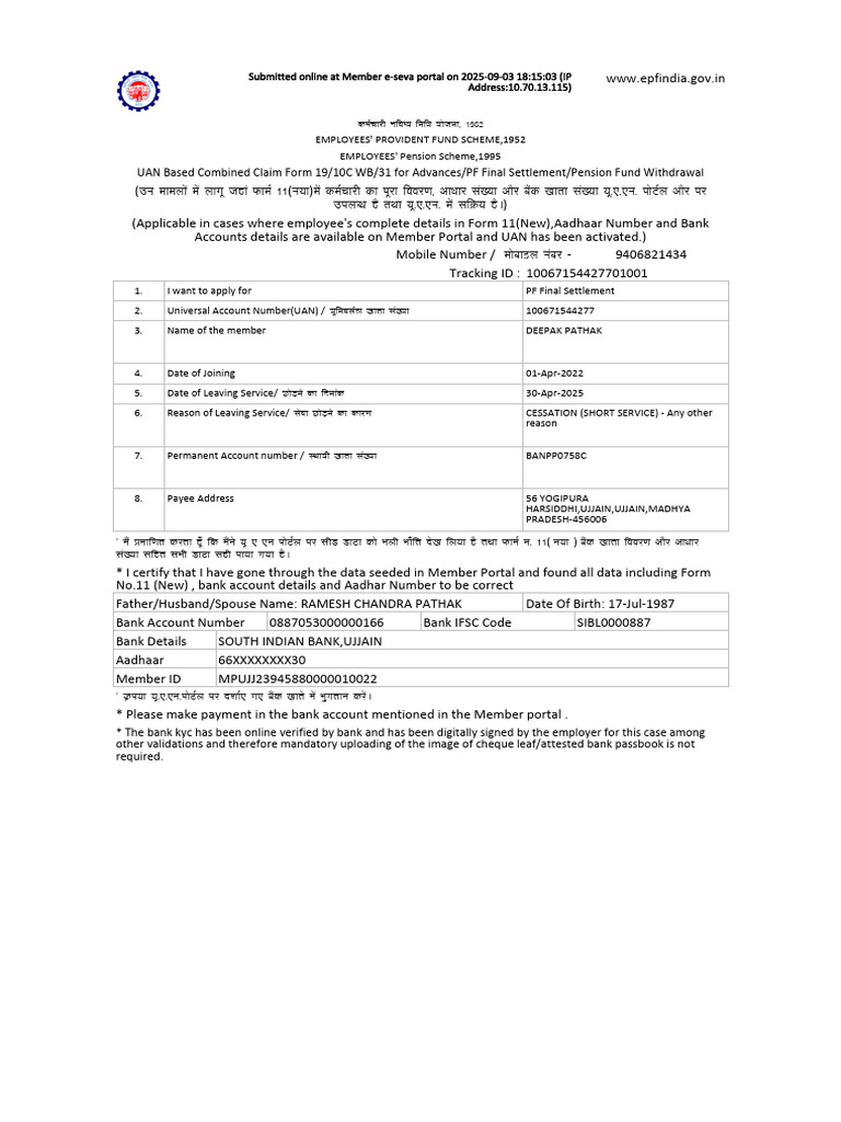 Submitted online at Member e-seva portal on 2025-09-03 18:15:03 (IP www.epfindia.gov.