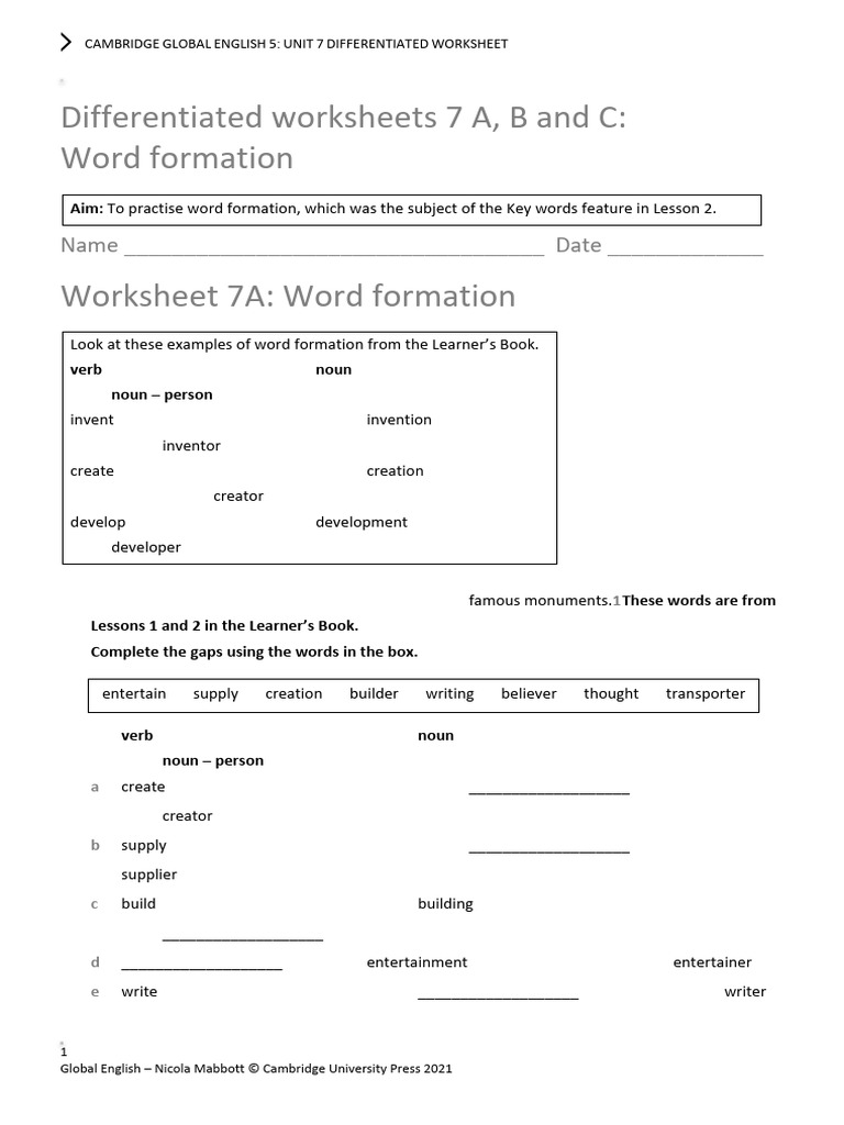 CAMBRIDGE GLOBAL ENGLISH 5: UNIT 7 DIFFERENTIATED WORKSHEET
