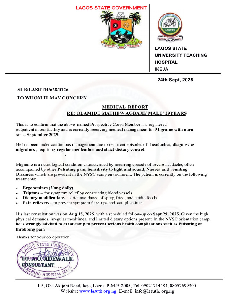 Dizziness which are prevalent in the NYSC camp environment. The patient is currently on the following