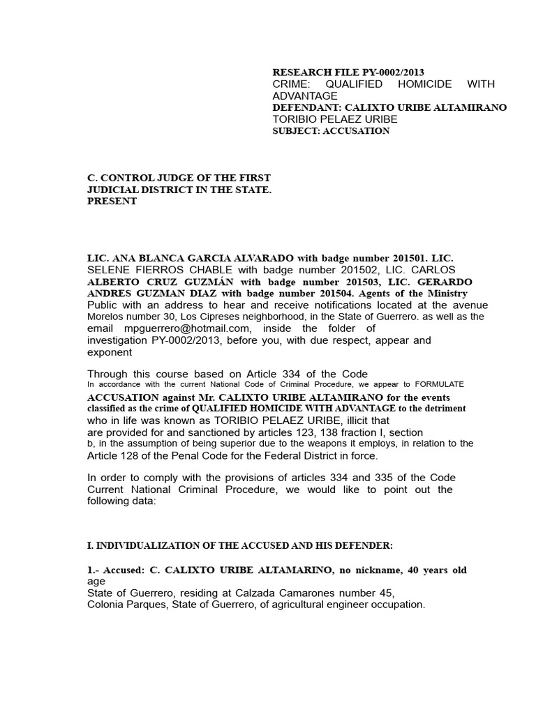 ACCUSATION against Mr. CALIXTO URIBE ALTAMIRANO for the events