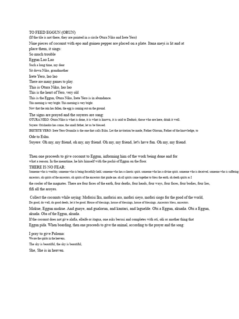 Mokue, Eggun mokue. And guaye, and gualorun, and kantari, and laguelde. Obi a Eggun, akuaña. Obi a Eggun,