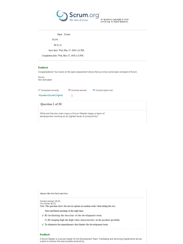 Congratulations! Your score on the open assessment shows that you know some basic concepts of Scrum.