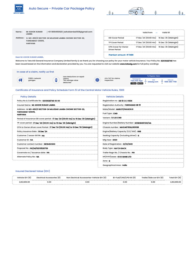Insured Name : Mr ASHOK KUMAR LAMBA Registration Authority : FARIDABAD HR 51