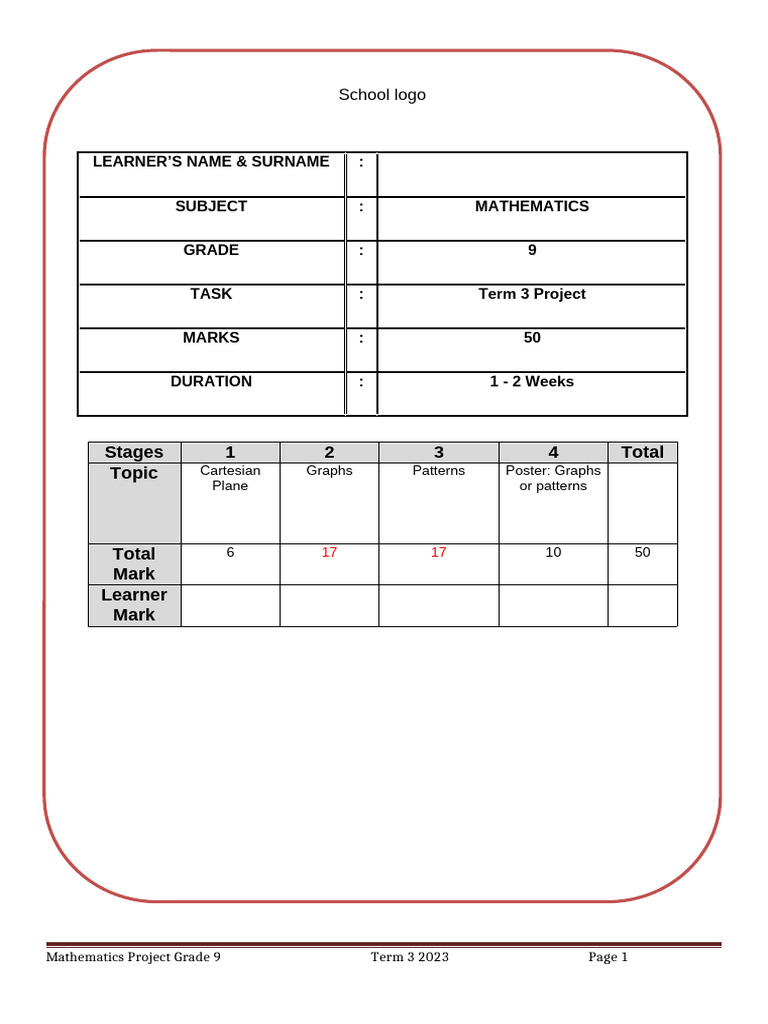 Mathematics Project Grade 9 Term 3 2023 Page 1