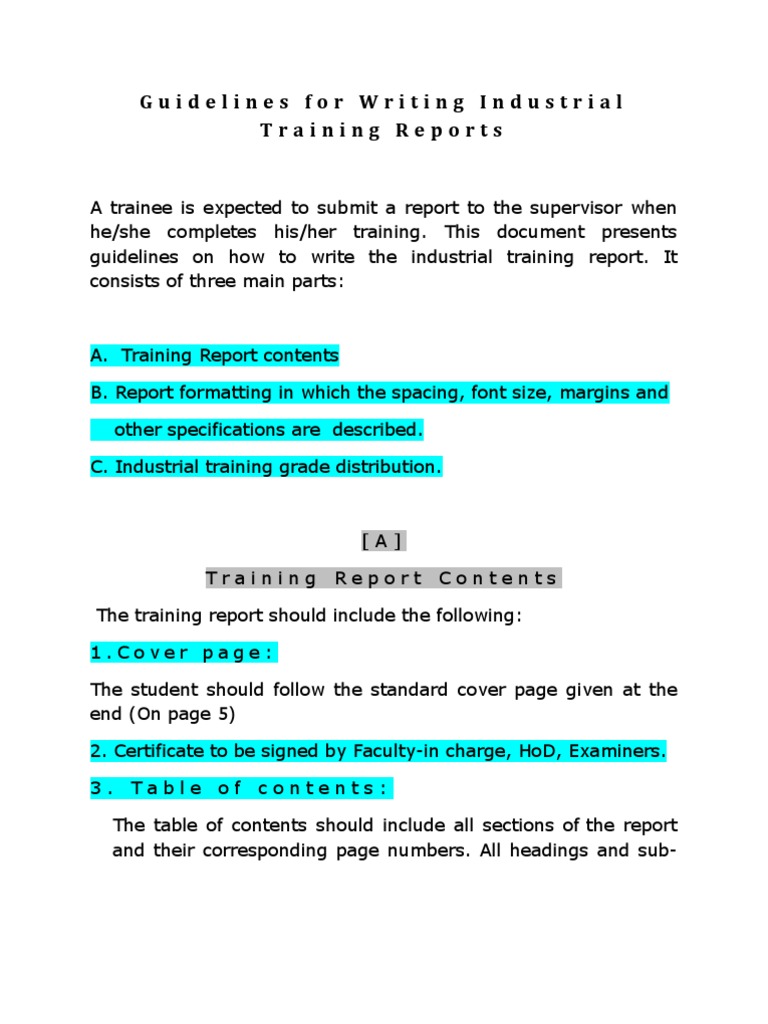 A. Training Report contents B. Report formatting in which the spacing, font size, margins and other specifications are described. C. Industrial training grade distribution.
