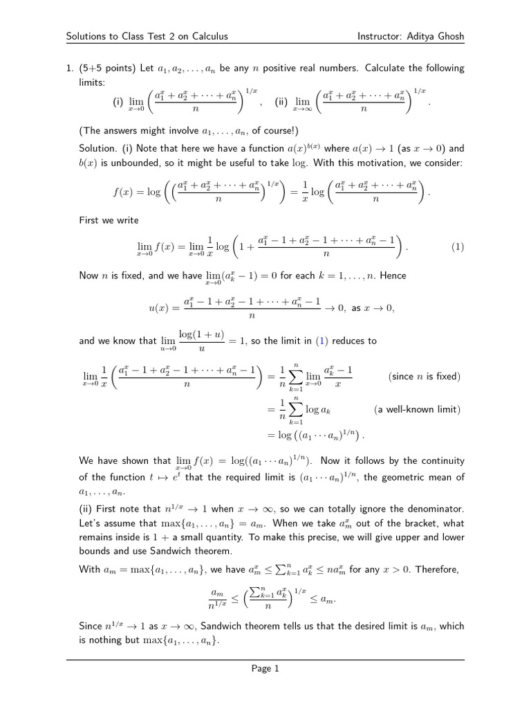 Solutions to Class Test 2 on Calculus Instructor: Aditya Ghosh