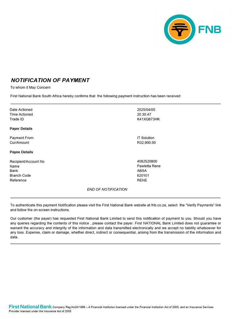 To authenticate this payment Notification please visit the First National Bank website at fnb.co.za, select the “Verify Payments” link
