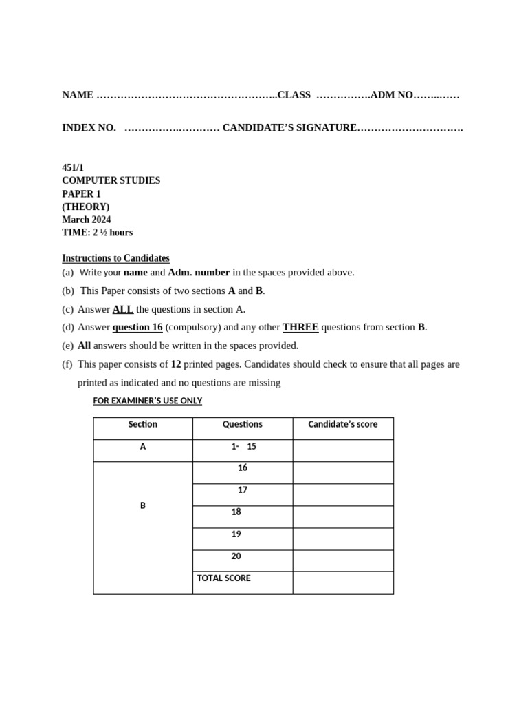 (a) Write your name and Adm. number in the spaces provided above.
