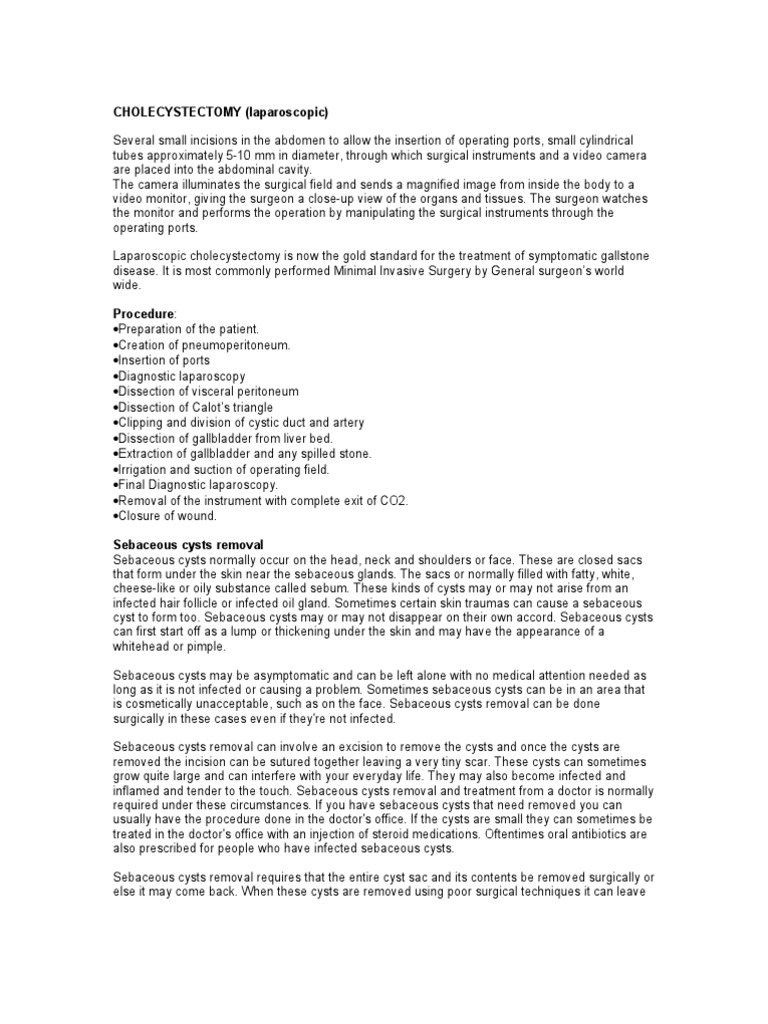 approximately 5-10 mm in diameter, through which surgical instruments and a video camera are placed into the abdominal cavity. The camera illuminates the surgical field and sends a magnified image from inside the body to a video monitor, giving the surgeon a close-up view of the organs and tissues. The surgeon watches the monitor and performs the operation by manipulating the surgical instruments through the operating ports. Laparoscopic cholecystectomy is now the gold standard for the treatment of symptomatic gallstone disease. It is most commonly performed Minimal Invasive Surgery by General surgeons world wide. Procedure: Preparation of the patient. Creation of pneumoperitoneum. Insertion of ports Diagnostic laparoscopy Dissection of visceral peritoneum Dissection of Calots triangle Clipping and division of cystic duct and artery Dissection of gallbladder from liver bed. Extraction of gallbladder and any spilled stone. Irrigation and suction of operating field. Final Diagnostic laparoscopy. Removal of the instrument with complete exit of CO2. Closure of wound. Sebaceous cysts removal Sebaceous cysts normally occur on the head, neck and shoulders or face. These are closed sacs that form under the skin near the sebaceous glands. The sacs or normally filled with fatty, white, cheese-like or oily substance called sebum. These kinds of cysts may or may not arise from an infected hair follicle or infected oil gland. Sometimes certain skin traumas can cause a sebaceous cyst to form too. Sebaceous cysts may or may not disappear on their own accord. Sebaceous cysts can first start off as a lump or thickening under the skin and may have the appearance of a whitehead or pimple. Sebaceous cysts may be asymptomatic and can be left alone with no medical attention needed as long as it is not infected or causing a problem. Sometimes sebaceous cysts can be in an area that is cosmetically unacceptable, such as on the face. Sebaceous cysts removal can be done surgically in these cases even if they're not infected. Sebaceous cysts removal can involve an excision to remove the cysts and once the cysts are removed the incision can be sutured together leaving a very tiny scar. These cysts can sometimes grow quite large and can interfere with your everyday life. They may also become infected and inflamed and tender to the touch. Sebaceous cysts removal and treatment from a doctor is normally required under these circumstances. If you have sebaceous cysts that need removed you can usually have the procedure done in the doctor's office. If the cysts are small they can sometimes be treated in the doctor's office with an injection of steroid medications. Oftentimes oral antibiotics are also prescribed for people who have infected sebaceous cysts. Sebaceous cysts removal requires that the entire cyst sac and its contents be removed surgically or else it may come back. When these cysts are removed using poor surgical techniques it can leave