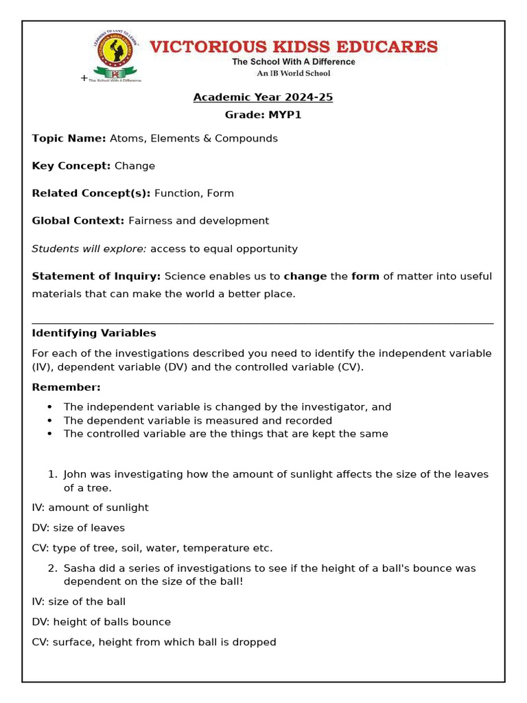 Topic Name: Atoms, Elements & Compounds