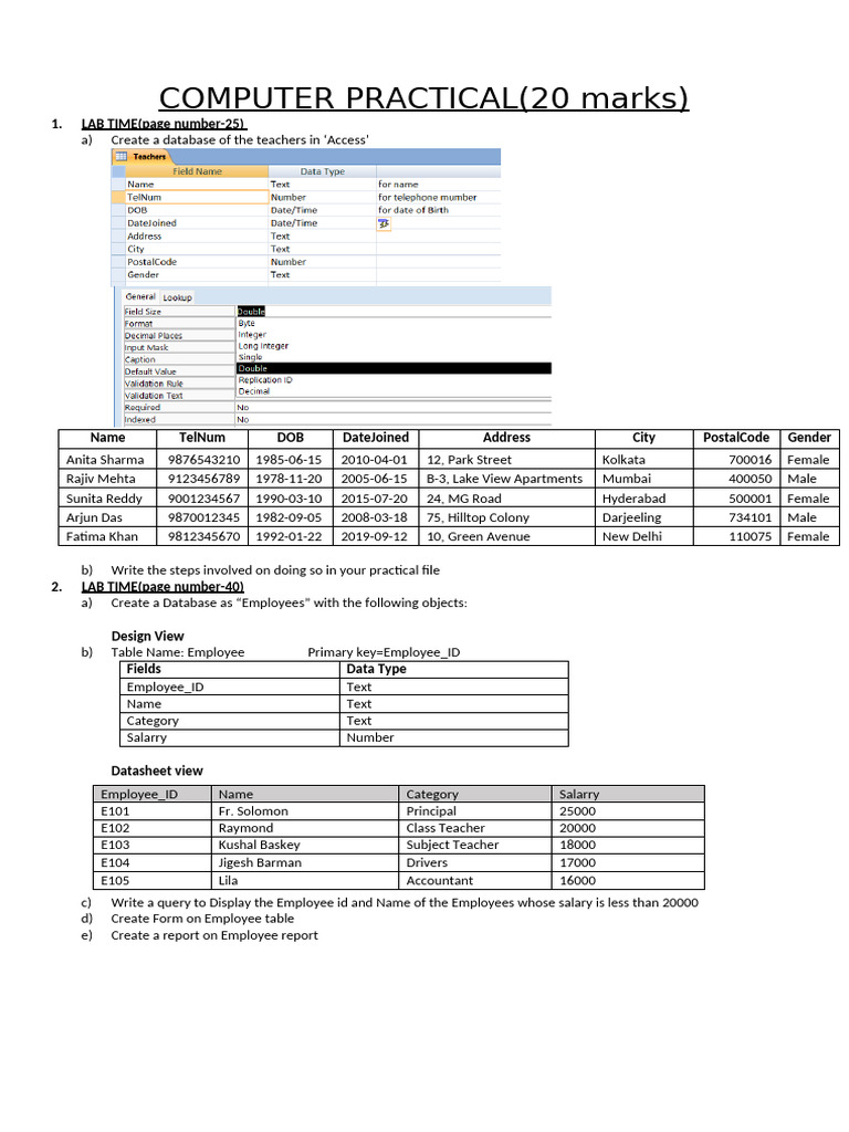a) Create a database of the teachers in ‘Access’