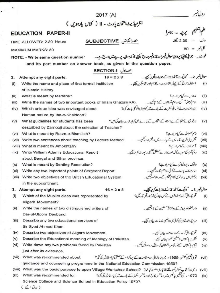 The document outlines an education examination paper with various sections, including subjective and objective questions related to Islamic history, educational policies, and significant figures in education. It covers topics such as the Aligarh Movement, the role of Imam Ghazali, and the challenges faced in female education in Pakistan. The paper includes specific instructions for answering questions and emphasizes the importance of adhering to guidelines for marking responses.