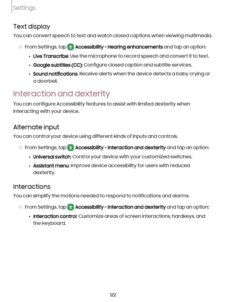 ◌ From Settings, tap Accessibility > Interaction and dexterity and tap an option: