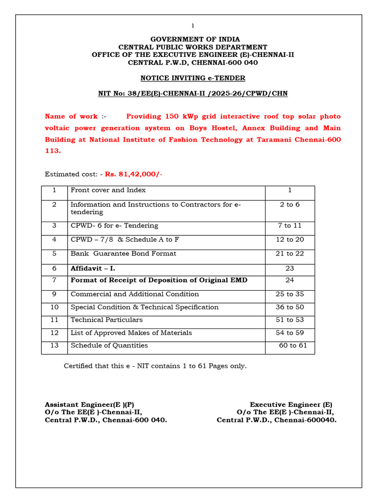 Name of work: Providing 150 kWp grid interactive roof top solar photo voltaic
