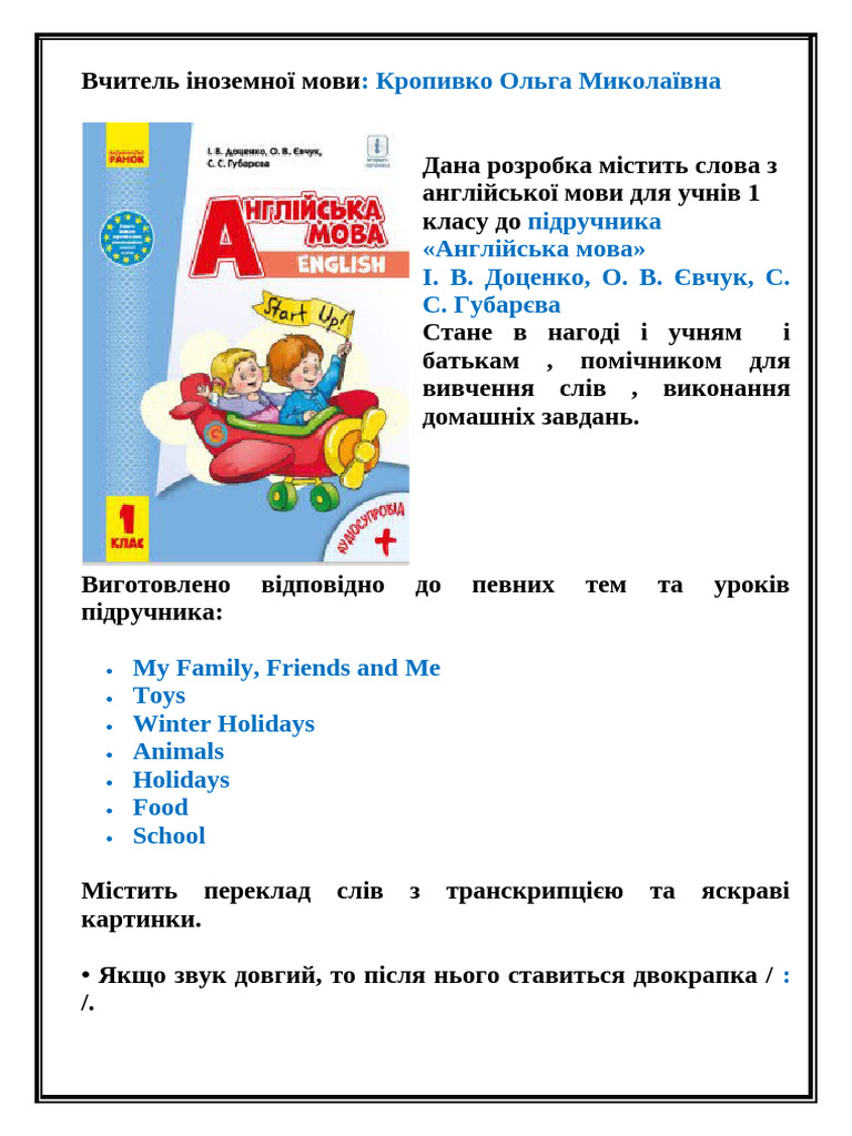 Вчитель іноземної мови: Кропивко Ольга Миколаївна