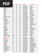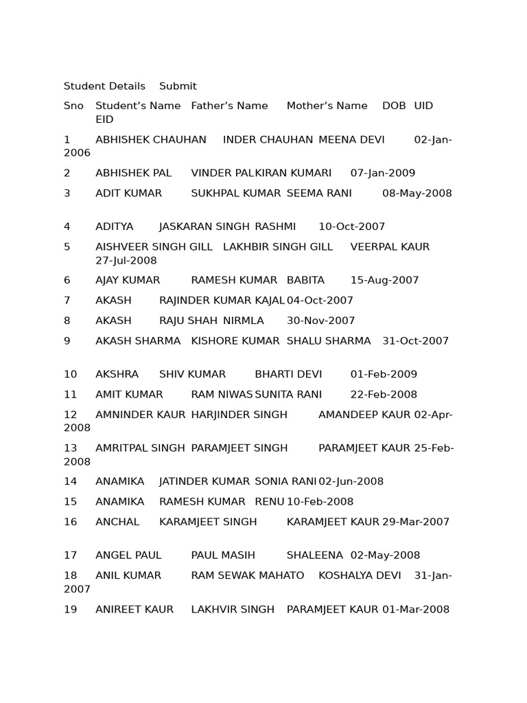Sno Student’s Name Father’s Name Mother’s Name DOB UID