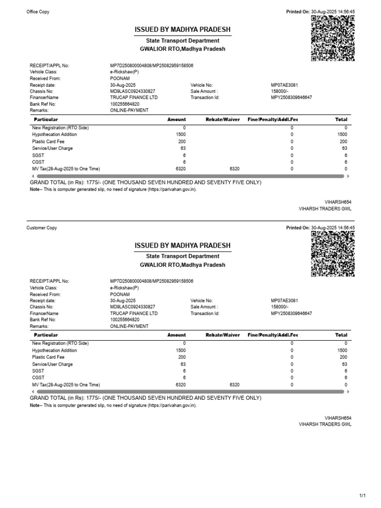 Receipt date: 30-Aug-2025 Vehicle No: MP07AE3081