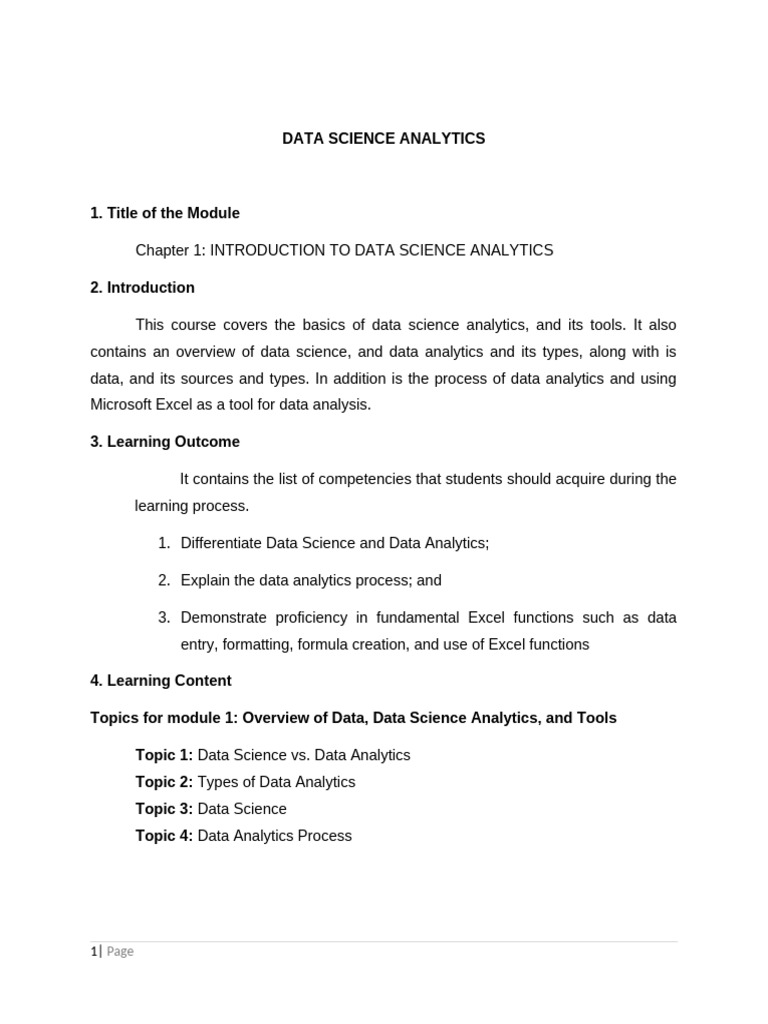 Topics for module 1: Overview of Data, Data Science Analytics, and Tools