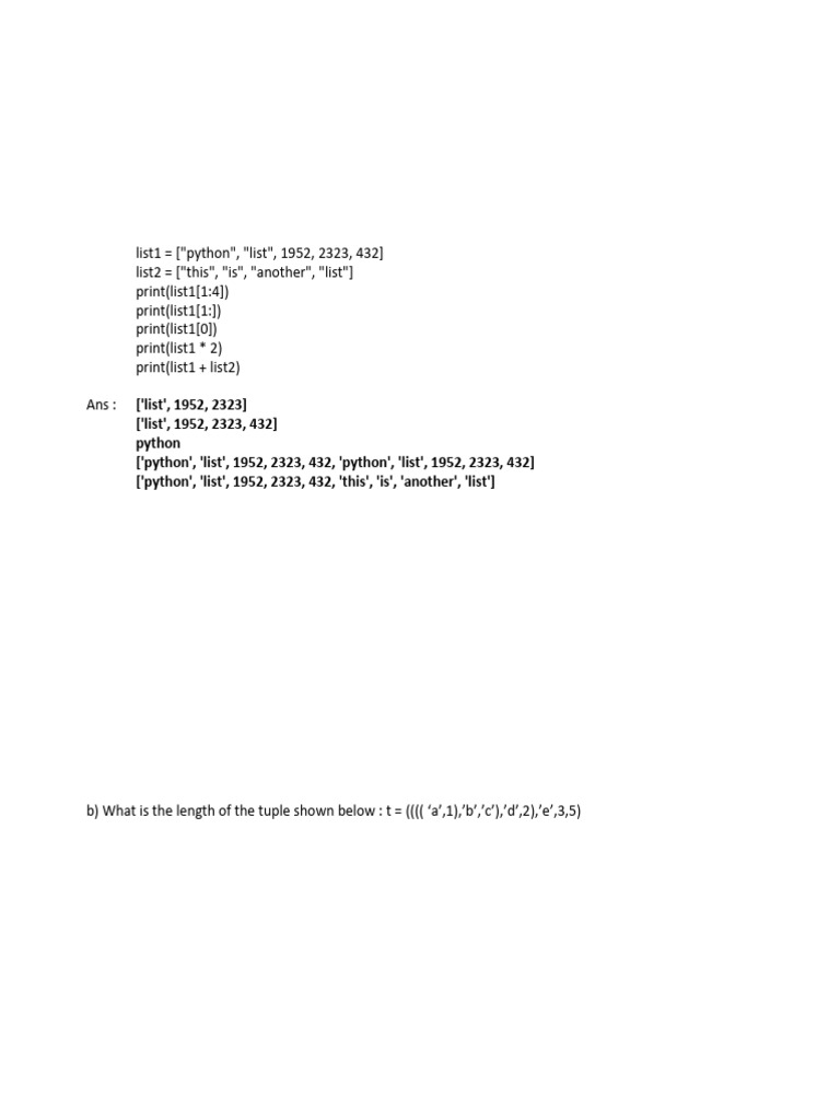 b) What is the length of the tuple shown below : t = (((( ‘a’,1),’b’,’c’),’d’,2),’e’,3,5)